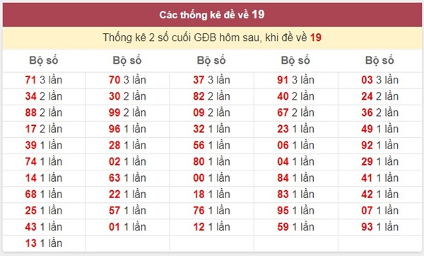 Theo kết quả thống kê với bảng thống kê thực tế từ các đài xổ số kiến thiết thì nếu ngày hôm trước đề đã về là 19 thì hôm sau nhiều khả năng sẽ ra những cặp số lô tô là 27 và 72.